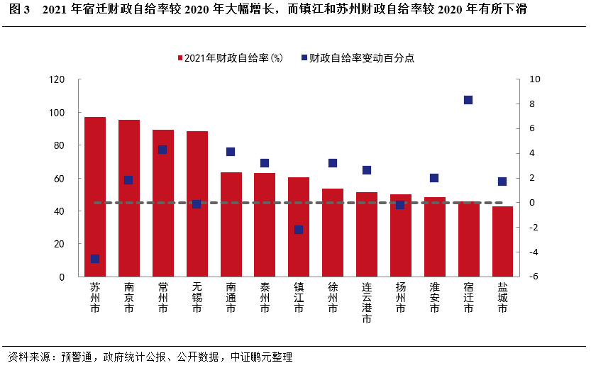 財(cái)政自給率方面,2021年蘇州和鎮(zhèn)江財(cái)政自給率較2020年分別下滑4.59個(gè)百分點(diǎn)、2.20個(gè)百分點(diǎn)至97.15%和60.29%,無錫和揚(yáng)州財(cái)政自給率基本和2020年持平,宿遷財(cái)政自給率提升較為明顯,2021年宿遷財(cái)政自給率上升8.28個(gè)百分點(diǎn)至45.80%,主要系2021年宿遷綜合財(cái)力較2020年增加明顯,且一般公共預(yù)算支出變動(dòng)不大所致。