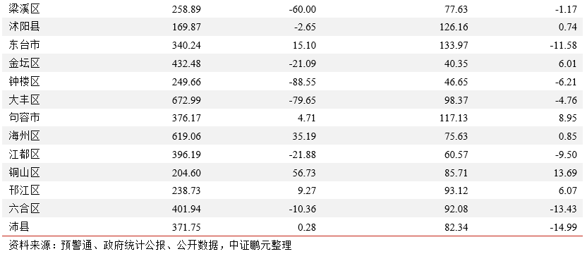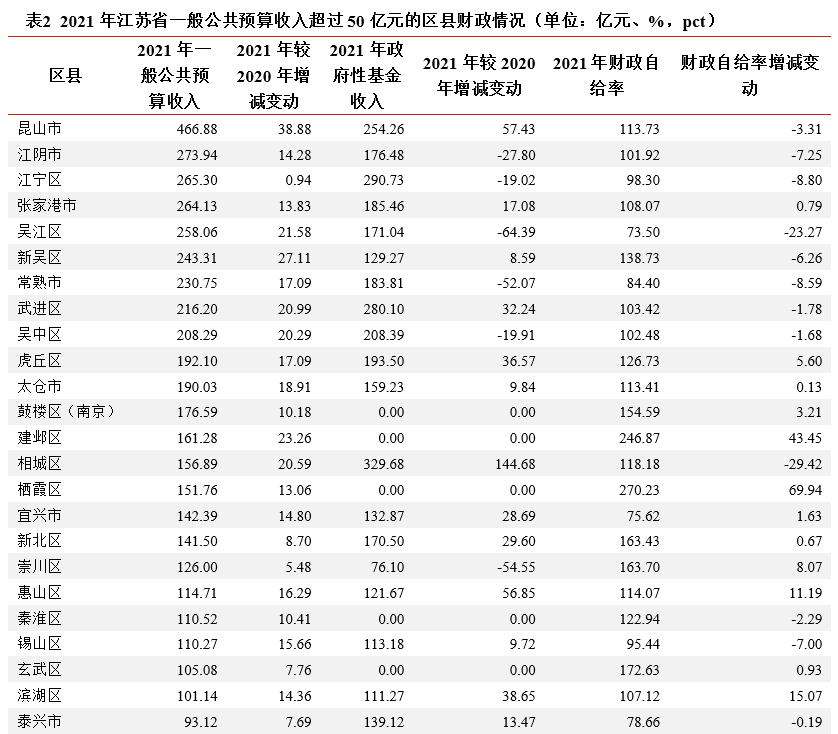 財(cái)政情況:2021年宿遷財(cái)政自給率大幅提高,95個(gè)區(qū)縣中有33個(gè)區(qū)縣財(cái)政自給率表現(xiàn)弱于去年。2021年江蘇省各地級(jí)市一般公共預(yù)算收入和政府性基金收入均較2020年有所提高,2021年宿遷財(cái)政自給率表現(xiàn)亮眼,較2020年提高8.28個(gè)百分點(diǎn)至45.80%,蘇州、南京、常州和無錫經(jīng)濟(jì)實(shí)力依舊較強(qiáng)、財(cái)政自給率依舊較高。區(qū)縣層面,2021年江蘇省絕大部分區(qū)縣一般公共預(yù)算收入和政府性基金收入均有所增長,昆山、江陰和江寧區(qū)一般公共預(yù)算收入仍穩(wěn)居頭部,但2021年邗江區(qū)一般公共預(yù)算收入下滑5.70億元至54.41億元,吳江區(qū)政府性基金收入下滑64.39億元至171.04億元,相城區(qū)、京口區(qū)、天寧區(qū)、吳江區(qū)和鐘樓區(qū)財(cái)政自給率較去年同期下降20個(gè)百分點(diǎn)以上。