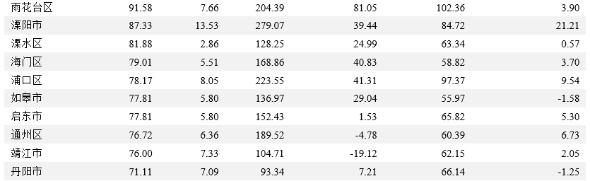 2021年除邗江區(qū)外,江蘇省其他各區(qū)縣GDP規(guī)模均有所提升,響水縣GDP增速下滑0.1個(gè)百分點(diǎn)。2021年江蘇省各區(qū)縣GDP規(guī)模大多處于增長狀態(tài),其中昆山、江陰和張家港市GDP規(guī)模仍處于頭部位置,且2021年張家港GDP突破三千億大關(guān),新吳區(qū)和宜興市則突破兩千億大關(guān)。但邗江區(qū)2021年GDP下滑10.72億元至1,117.29億元。GDP增速方面,除盱眙縣、沛縣、贛榆區(qū)和豐縣未獲得GDP增速外,2021年江蘇省大部分區(qū)縣GDP增速均高于2020年,但響水縣GDP增速下滑0.1個(gè)百分點(diǎn)至6.0%。