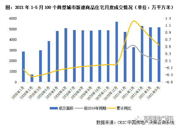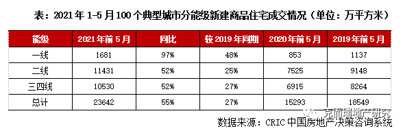 CRIC數據統計顯示,全國100個典型城市2021年1-5月商品住宅成交面積合計23642萬平方米,同比增長過半,較之2019年同期增長27%。