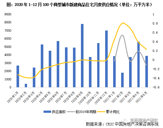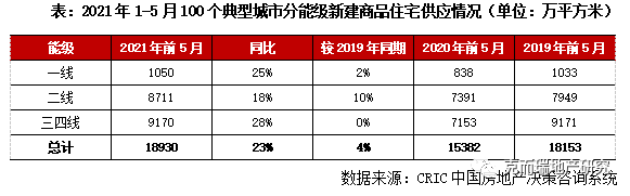 據CRIC統計,2021年1-5月全國100個重點城市商品住宅新增供應面積18930萬平方米,同比增長23%,相較2019年同期增長4%。