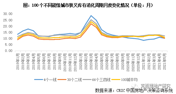 縱觀2021年上半年百城消化周期變動趨勢,1-4月基本在12個月左右持穩,5月得益于狹義庫存微降,成交熱度延續,與上月基本持平,去化周期穩中有降,由2021年4月末的12.34個月微降至10.79個月,顯著低于2020年同期水平。