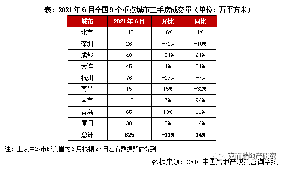二季度末,各省市成交規模持續走低,經歷“小陽春”市場顯著放量,年中市場逐漸恢復理性,月成交規模穩步“三連降”。整體來看,6月全國9個重點城市二手房成交體量為625萬平方米,環比回落11%,同比仍有14%增幅。