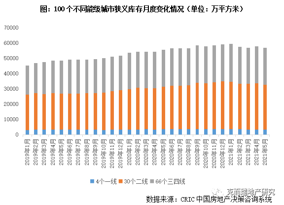 2021年開年以來,狹義庫存除2月顯著跳減之外,一直延續高位震蕩態勢。據CRIC監測數據,2021年5月百城商品住宅庫存量達到了56926萬平方米,環比微降1%,同比增長2%?!敖鹑y四”銷售旺季已過,5月房企推盤積極性略有回落,環比4月下降三成;成交熱度延續,整體成交量與“銀四”基本持平:一線、三四線城市同環比齊降,需求釋放后略有回落;二線城市市場熱度穩步回升,同環比齊增,顯著好于去年同期??傮w來看,成交量略高于供應量,狹義庫存小幅微降。