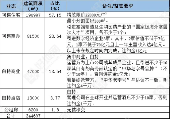 須設置不少于3萬平方米的集中商業和不少于1萬平方米的酒店各一處,集中商業部分和酒店部分須100%自持。 此外還對商業部分進行的細致規定: