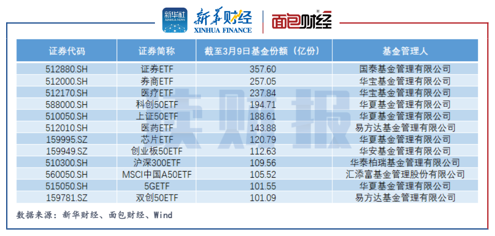 根據所屬類型劃分,股票型ETF的規模占據絕對主導地位,最新的資產凈值超過9000億元、基金份額超過6500億份。其中,共有12只基金截至今年3月9日的基金份額超過100億份,證券ETF、券商ETF、醫療ETF位居前三,基金份額分別為357.60億份、257.05億份以及237.84億份。