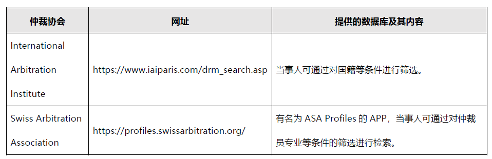 許多仲裁機構、仲裁協會和民間機構會制作仲裁員數據庫方便當事人選擇仲裁員。同時,在一些特殊的仲裁領域也會有專門的數據庫供查詢。[7]