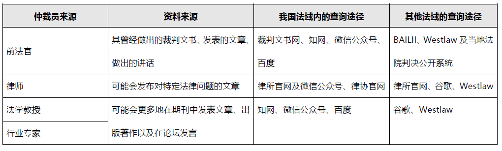 仲裁員以往對類似法律問題的觀點也是重要的考慮因素,裁判思維直接影響仲裁員對爭議問題的認定和裁決結果。針對仲裁員來源的不同,可以通過不同渠道了解仲裁員的觀點: