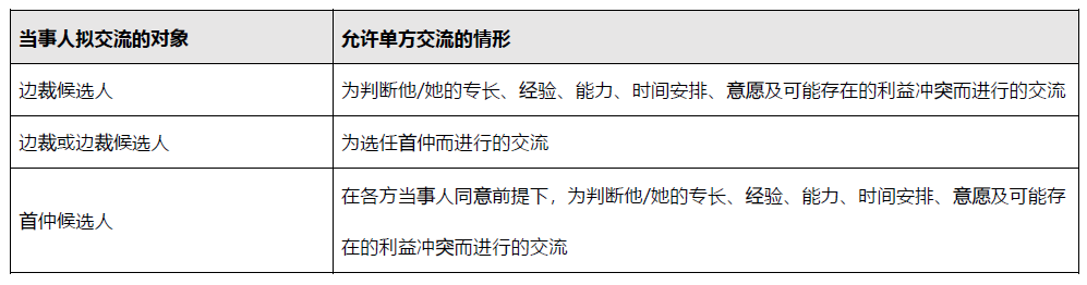 而對于單方交流的內容,《當事人代理指引》中指出應僅限于提供爭議的概括性描述以及獲取有關潛在仲裁員是否合適的信息。一般可交流的話題有: