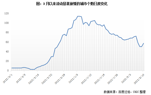 從城市個(gè)數(shù)日度變化來看,3月中旬流動顯著放緩的城市個(gè)數(shù)出現(xiàn)明顯上升趨勢,而此時(shí)恰是上海疫情擴(kuò)散期及吉林疫情膠著期。流動顯著放緩城市的個(gè)數(shù)在4月5日-4月7日達(dá)到高峰期,有多達(dá)110余個(gè)城市近七日遷徙指數(shù)同比低于50%。隨著吉林疫情基本得到控制、上海疫情態(tài)勢穩(wěn)中向好,流動放緩城市個(gè)數(shù)自4月中旬開始下降。而近期北京、天津疫情再起,流動放緩城市數(shù)量走勢有抬頭趨勢,至5月10日流動放緩城市的數(shù)量仍有57個(gè)。