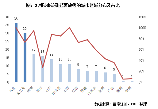 為了探知3月以來有多少城市曾經(jīng)或正在“慢下來”,我們以連續(xù)7天百度遷徙指數(shù)同比降幅超過50%作為該城市日常流動顯著放緩的標(biāo)準(zhǔn),測算了全國365個(gè)城市或地區(qū)在3月以來的遷徙指數(shù)變化情況。最終,我們發(fā)現(xiàn),在此標(biāo)準(zhǔn)下,約有170個(gè)城市在3月后出現(xiàn)流動放緩的現(xiàn)象,占比高達(dá)47%。