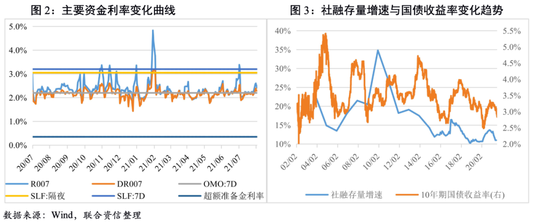 7月政治局會議較4月的政治局會議刪除了“不急轉彎”的表述,但同時強調“要做好宏觀政策跨周期調節”,會議強調“穩健的貨幣政策要保持流動性合理充裕,助力中小企業和困難行業持續恢復”,與7月初國常會議表示對中小企業支持態度相一致,疊加當前MLF存量為歷史最高值,因此下半年不排除通過降準置換MLF的方式推動銀行端負債成本下降以達到降低中小企業融資成本的目的。結構性信用寬松政策疊加政府債發行,或將帶動下半年社融存量增速觸底反彈。從圖3可以看出,社融存量增速與國債收益率走勢相關性較高,且領先十年期國債收益率,因此同樣支持短期內國債收益率下行,但長期走勢還需要進一步確認基本面走勢。