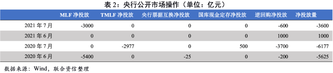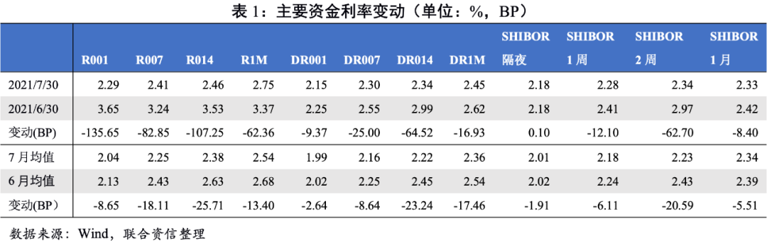 7月資金面相對較為寬松,主要資金利率月度均值全面下行。全面降準后,央行雖然并未降低MLF操作利率且縮量續作,共計釋放了7000億的流動性。隨著銀行月末考核臨近,7月底資金利率有所上行,7月28日,R007和DR007分別升至2.60%和2.39%的月內高點,較去年同期有所提高,但低于2019年同期。