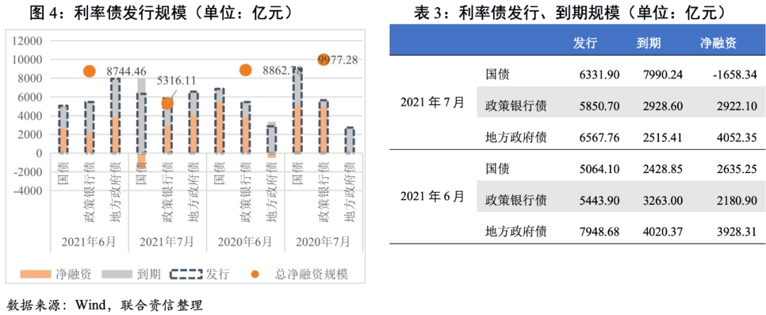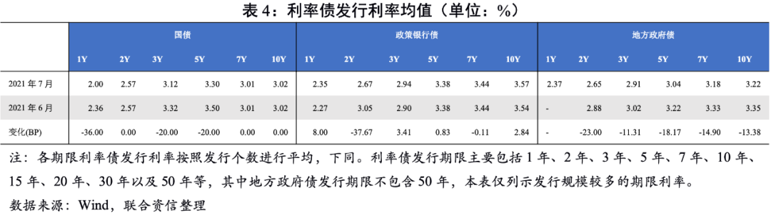 從發行利率看,7月國債受資金面及避險情緒影響,配置需求較強,短端發行利率下行明顯;政策銀行債發行利率漲跌不一,主要是6月國開行發行了1年、3年和5年期的境內美元債,發行票面利率拉低了平均值;地方政府融資成本回落,7月地方政府債主要期限發行利率較6月均出現下行。