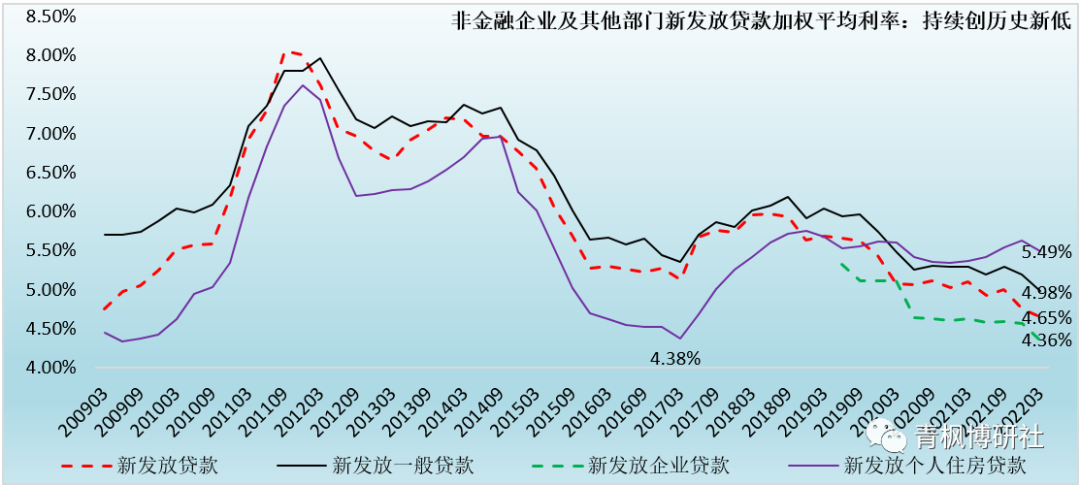 (一)央行在2021年2季度貨幣政策執(zhí)行報(bào)告(參見如何理解央行2021年2季度貨幣政策執(zhí)行報(bào)告?)中指出新發(fā)放貸款利率創(chuàng)有統(tǒng)計(jì)以來(lái)新低,而當(dāng)時(shí)的新發(fā)放貸款利率是4.93%。不過現(xiàn)在看來(lái)當(dāng)時(shí)的新低并不是最低,續(xù)創(chuàng)新低的態(tài)勢(shì)仍在持續(xù),2021年四季度和2022年一季度新發(fā)放貸款利率分別為4.76%和4.65%,持續(xù)創(chuàng)有統(tǒng)計(jì)以來(lái)新低,且基本符合我們之前5%以下的判斷(參見LPR如期下調(diào),未來(lái)貸款利率低于5%可能是常態(tài))。