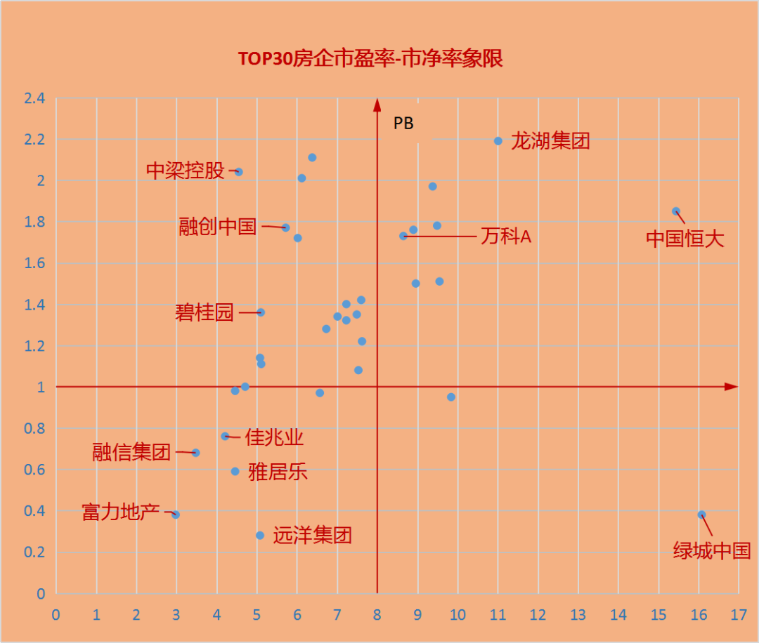以市凈率1.0、市盈率8.0為坐標(biāo)原點(diǎn)。對(duì)TOP30房企進(jìn)行分類(lèi)。