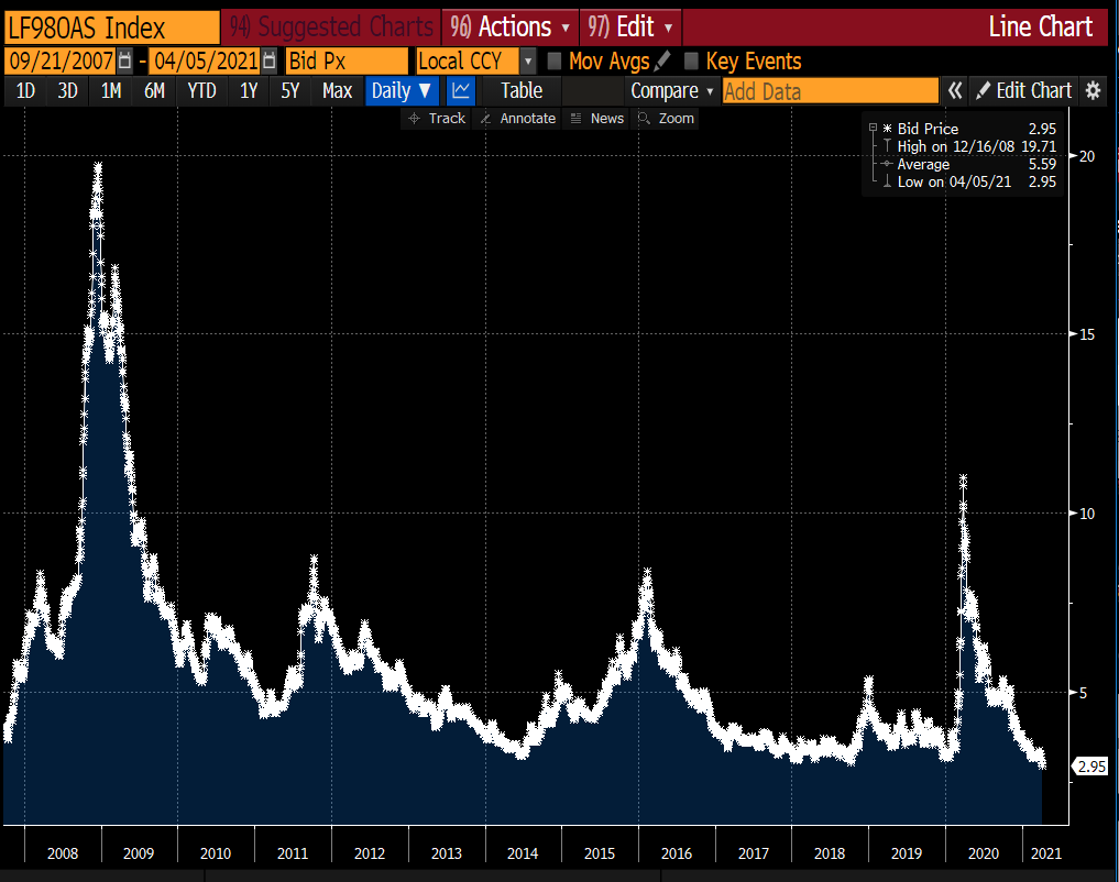 需求端,疫情以來美聯(lián)儲持續(xù)進行量化寬松,以每個月1200億美元的節(jié)奏購買美國國債及房貸支持證券,對美元債券市場釋放了天量的流動性。在美國經濟重啟、通脹大幅抬升的背景下,美聯(lián)儲至今沒有釋放縮減購債的信號。這也進一步抬升了投資者的風險偏好,使得美國垃圾債到期收益率低于4%、信用利差低于300bps的歷史最低位,也形成了市場對大量低評級甚至無評級的中資地產美元債的強勁需求。