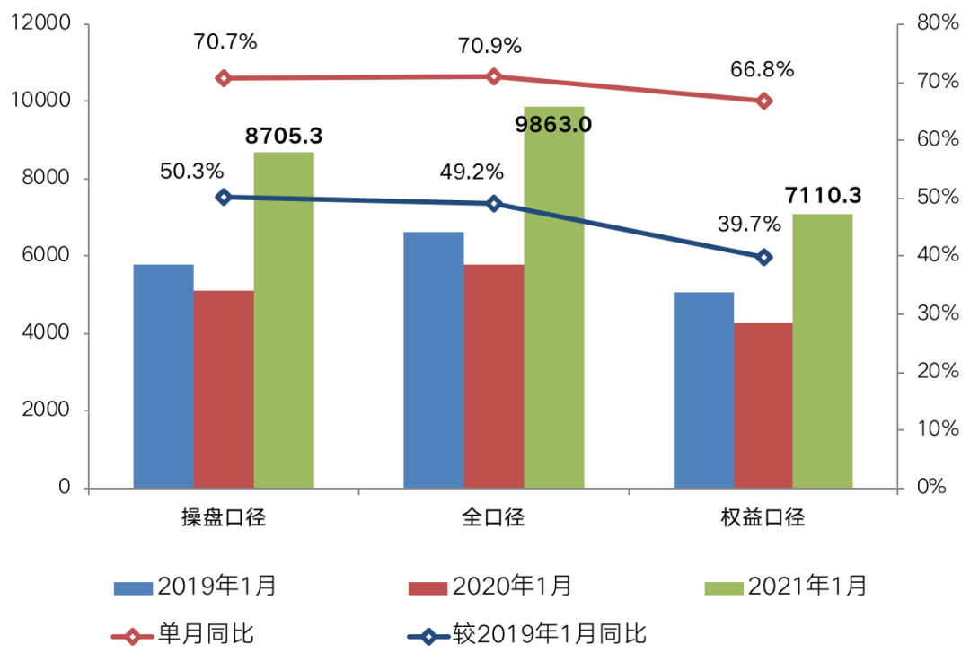 受去年同期正值春節假日,疊加新冠疫情的爆發、市場全面停擺影響,整體成交基數較低,2021年1月百強房企銷售數據在去年基數較低的基礎上出現強勢反彈,整體業績規模較去年同期大幅上升70.7%,較2019年同期增長50.3%。