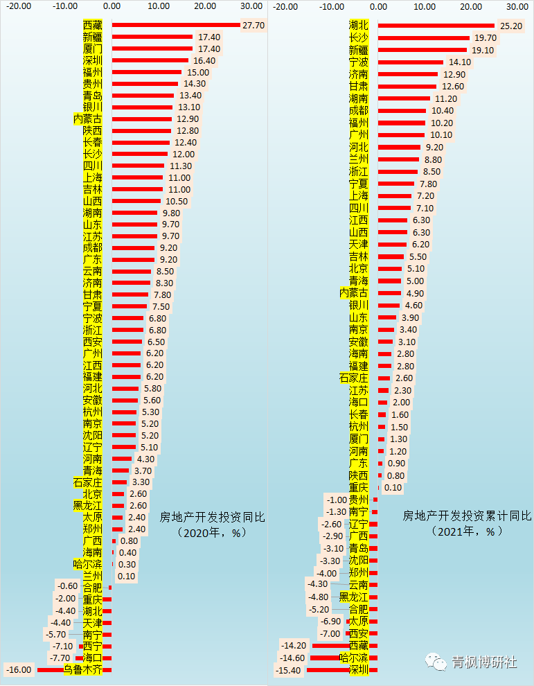 (一)從房地產(chǎn)開(kāi)發(fā)投資同比來(lái)看,西藏、西安、太原、合肥、黑龍龍江、云南、鄭州、沈陽(yáng)、青島等地下滑同樣比較大。2021年前三季度,鄭州地產(chǎn)開(kāi)發(fā)投資同比下降4%,但如果從全年數(shù)據(jù)來(lái)看,則可能更糟心,這大概也是鄭州大幅放松地產(chǎn)調(diào)控的原因。
