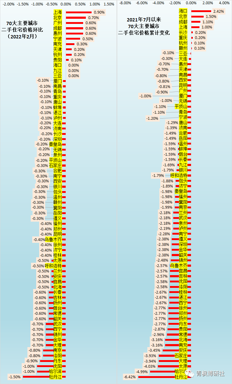 (二)從房?jī)r(jià)變化來(lái)看,2022年2月當(dāng)月,70大城市中有57個(gè)城市的二手住宅價(jià)格環(huán)比出現(xiàn)了下降,23個(gè)城市下降幅度超過(guò)0.50%,沈陽(yáng)、哈爾濱、牡丹江等三個(gè)東北城市的下降幅度均超過(guò)1%。當(dāng)然,若從2021年7月以來(lái)的6個(gè)月累計(jì)下降幅度來(lái)看,70個(gè)大中城市中的62個(gè)城市二手住宅價(jià)格出現(xiàn)了下降,牡丹江、哈爾濱、太原、大理、石家莊、安慶、南充、北海等城市的二手住宅價(jià)格累計(jì)下降幅度均超過(guò)3%,其中哈爾濱與牡丹江分別下降6.42%和4.99%。