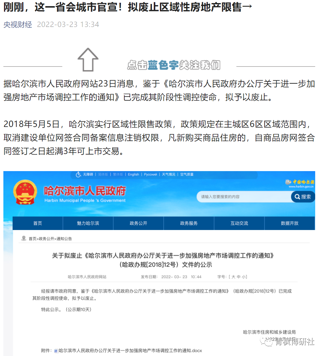 (一)地產(chǎn)行業(yè)風(fēng)險(xiǎn)仍在持續(xù)釋放的背景下,因城施策的各地動(dòng)向備受關(guān)注。2022年3月23日,哈爾濱市住建局在哈爾濱市政府官網(wǎng)披露的信息顯示,經(jīng)報(bào)請(qǐng)市政府同意,鑒于《哈爾濱市人民政府辦公廳關(guān)于進(jìn)一步加強(qiáng)房地產(chǎn)市場(chǎng)調(diào)控工作的通知》(哈政辦規(guī)(2018)12號(hào))已完成其階段性調(diào)控使命,擬予以以廢止。值得關(guān)注的是,哈爾濱此舉,隨后得到經(jīng)濟(jì)日?qǐng)?bào)、央視財(cái)經(jīng)等官媒的轉(zhuǎn)載。