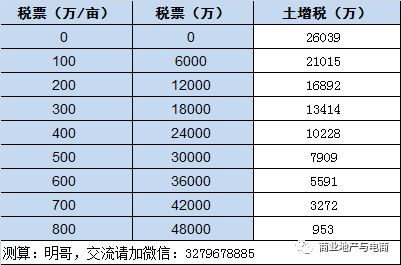 測算結果是應繳土增稅7909萬。接下來我們在不同的稅票金額假設下,測算土增稅和凈利率是如何隨著稅票變動的。