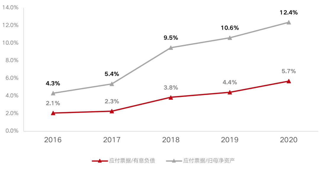 近期來,主流房企應付票據規模增速明顯高于有息債務增速,房企將有息債權融資壓力向供應鏈融資轉移。CRIC數據顯示,77家樣本房企應付票據/有息負債從2016年的2.1%增至2020年的5.7%,呈穩步增長態勢。