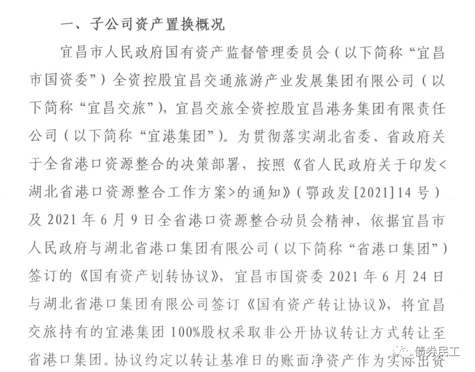 2、根據宜昌交通旅游產業發展集團有限公司2021年8月18日發布的公告,擬將全資控股的異常港務集團有限責任公司的股權以非公開協議轉讓的方式劃轉至湖北省港口集團有限責任公司,同時置換成對宜昌市建設投資控股集團有限公司的持股。公司的控股股東和實際控制人均是宜昌市國資委。公司的主體信用評級為AA,存續債券3只,存續債券金額為13億元。