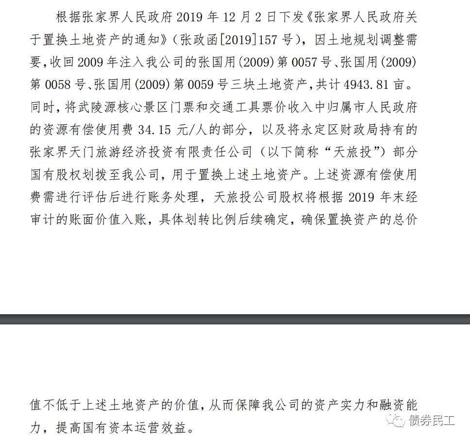 4、根據張家界市經濟發展投資集團有限公司于2020年6月9日發布的公告,將部分門票和交通工具收入、國有企業股權劃入公司,同時將三塊土地資產劃出,實現國有企業資產置換。公司的控股股東是和實際控制人是張家界市國資委。公司的主體信用評級為AA(中證鵬元和聯合資信),存續債券8只,存續債券金額為69.10億元。
