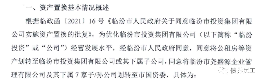 3、根據臨汾市投資集團有限公司2021年6月4日發布的公告,通過了持有人會議決議,擬將臨汾市的公租房等資產用于置換公司的 臨汾市堯盛源企業管理有限公司及其下屬7家子/孫公司等劃轉至臨汾市國資委。公司的控股股東是和實際控制人是臨汾市國資委。公司的主體信用評級為AA+,存續債券9只,存續債券金額為73億元。