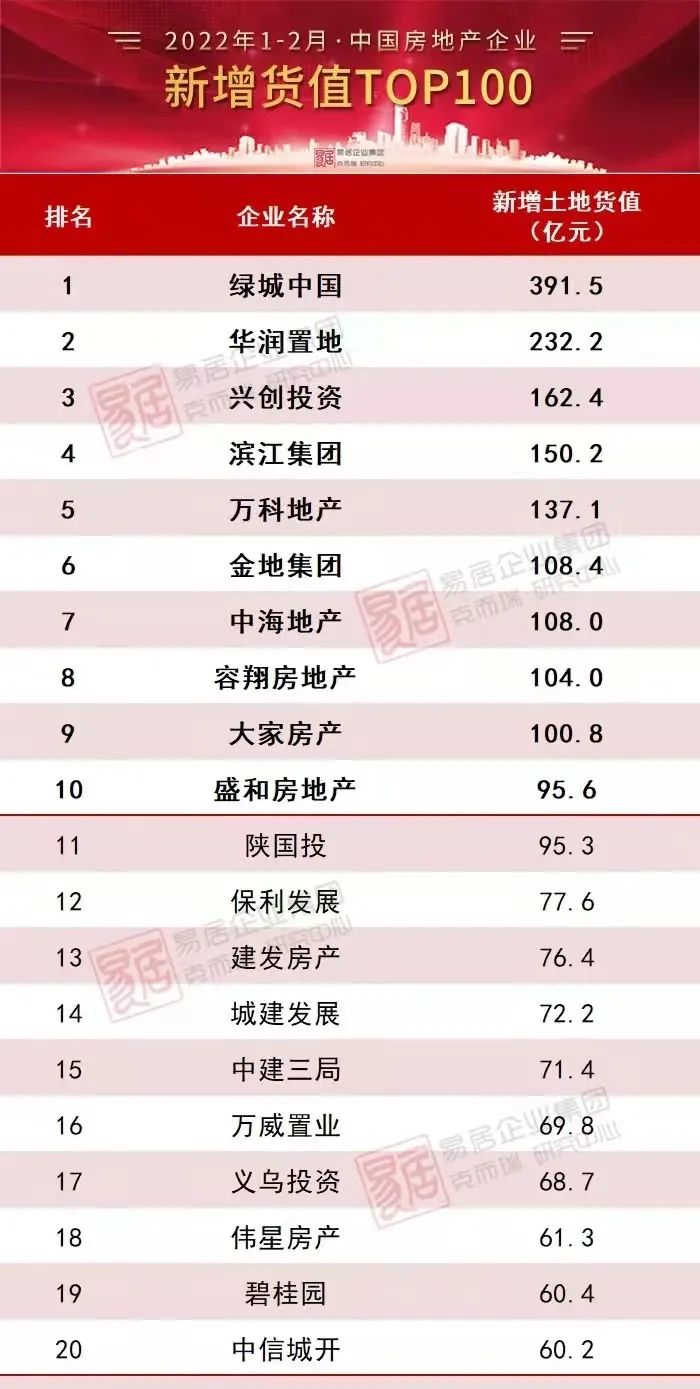 3月初,克而瑞發布了2022年1-2月房企新增貨值TOP100榜單。