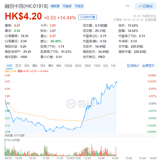 典型的如融創中國,上午還下跌了19個點,下午就一路攀升上漲到14個點,一天之內劇烈震蕩33個點。