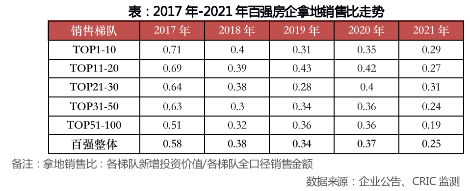 從歷年拿地銷售比變化來看,也足以顯示今年房企投資的謹慎程度:2021年百強房企新增土儲拿地銷售比僅為0.25,較去年下降0.12,與2017年的高峰相比則降幅超過50%,并創(chuàng)下近五年新低。