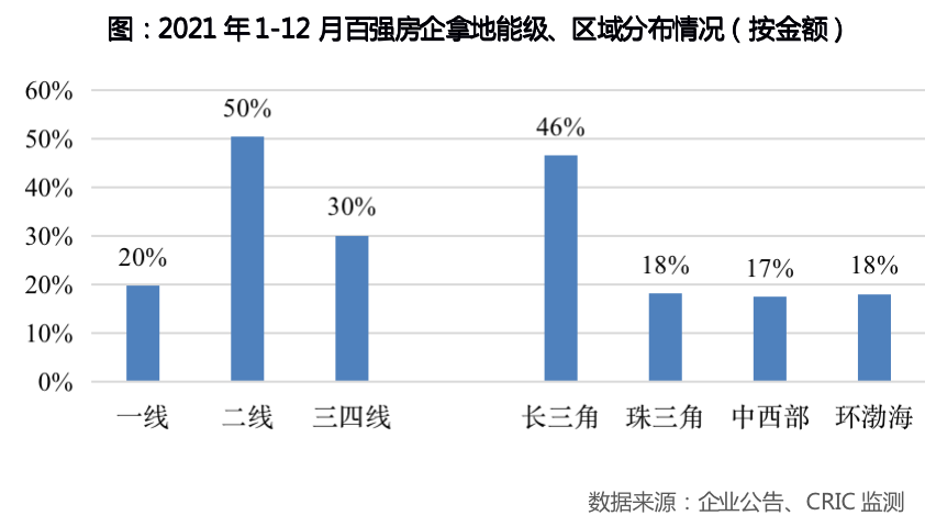 區(qū)域?qū)用妫L三角依然最受開發(fā)商青睞,百強房企全年投資金額中有46%集中于長三角,其次珠三角、中西部和環(huán)渤海各占17%-18%,整體形成了“一超三強”的格局。
