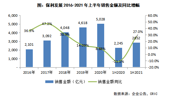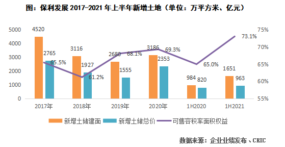 2021年上半年保利發(fā)展新增項(xiàng)目84個(gè),新增計(jì)容建筑面積達(dá)到1651萬平方米,拓展成本963億元,分別同比增長67.8%和17.4%,金額比為0.34,高于TOP10房企的0.30,拿地銷售面積比達(dá)到0.99。