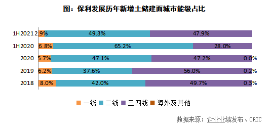 從城市布局來看,保利上半年減少了集中供地城市的拿地,重點(diǎn)22城的拿地建面占比同比下降了20個(gè)百分點(diǎn)至34%,將投資重點(diǎn)在三四線,三四線新增容積率面積同比增長了113.7%,占比達(dá)到47.9%,增幅有19.9個(gè)百分點(diǎn),其中,珠三角區(qū)域的茂名、佛山、汕尾、清遠(yuǎn)位居拿地建面TOP10城市。三四線城市拿地占比的提升,也使得保利2021年上半年的拿地均價(jià)同比下降了30.0%至5833元/平方米。