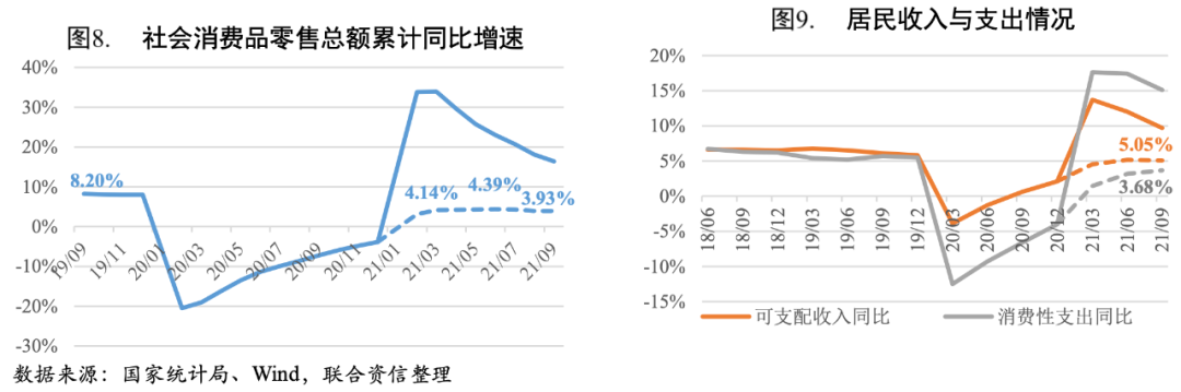 三季度消費復(fù)蘇放緩。2021年前三季度,我國社會消費品零售總額31.81萬億元,同比增長16.40%,兩年平均增速3.93%,較上半年兩年平均增速小幅回落,與疫情前水平仍有一定差距,三季度居民人均可支配收入、消費性支出修復(fù)同步放緩。中秋節(jié)假期以及十一小長假臨近帶動9月單月消費較8月的低點小幅反彈,疫情對消費的負(fù)面影響有所緩解。四季度消費仍會受到點狀散發(fā)疫情影響,但電商購物節(jié)等因素有助于帶動消費提升。