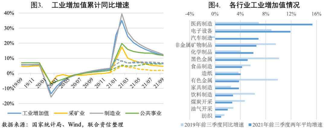 主要行業(yè)[3]方面,醫(yī)藥制造業(yè)、計算機、通信和其他電子設(shè)備制造業(yè)以及汽車制造業(yè)受出口帶動前三季度工業(yè)增加值兩年平均增速較高,但受芯片、電池等供應(yīng)鏈短缺影響,三季度特別是8月汽車制造產(chǎn)能擴張承壓;而黑色、有色金屬冶煉及延壓加工業(yè)和非金屬礦物制品業(yè)工業(yè)增加值較2019年下降較大,主要是限電限產(chǎn)等措施對鋼鐵、有色和水泥等高耗能行業(yè)產(chǎn)能負(fù)面影響較大,其中黑色金屬冶煉及壓延加工業(yè)工業(yè)增加值兩年平均增速繼續(xù)下滑,除了供給端的限制外,還受到需求端地產(chǎn)降溫的影響。