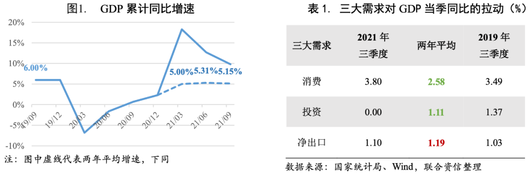 三季度經(jīng)濟修復(fù)放緩。三季度我國國內(nèi)生產(chǎn)總值29.10萬億元,同比增長4.90%,兩年平均增長4.90%,較二季度兩年平均增長(5.52%)有所放緩;三季度環(huán)比增長0.20%也較二季度(1.20%)明顯回落,三季度經(jīng)濟修復(fù)動能減弱,消費和投資對經(jīng)濟增長的拉動均不及疫情前同期,僅凈出口拉動作用高于疫情前。2021年前三季度,我國國內(nèi)生產(chǎn)總值82.31萬億元,不變價累計同比增長9.80%,兩年平均增長5.15%,較上半年兩年平均增速放緩0.16個百分點。