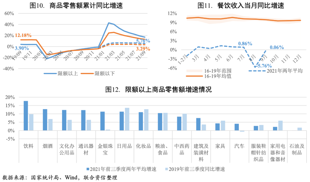 限額以下商品零售和接觸性服務(wù)仍是消費的主要拖累,商品零售與疫情前差距主要體現(xiàn)在限額以下的部分,限額以上商品零售額兩年平均增速均為正值,汽車銷售自二季度以來受芯片供應(yīng)短缺以及排放標(biāo)準(zhǔn)升級切換期等影響,兩年平均增速持續(xù)放緩,9月當(dāng)月汽車零售額兩年平均增速再次落入負(fù)值區(qū)間。三季度餐飲收入波動較大,8月受疫情沖擊大幅回落,9月回升至正值,接觸性消費由于對疫情變化更為敏感,整體波動較大且較疫情前水平差距較大。