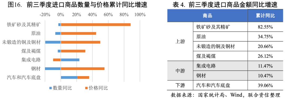 三季度以來,進口增速呈現(xiàn)逐步下行的趨勢,部分大宗商品量減價揚,國際大宗商品價格的上漲抑制了部分國內(nèi)需求。從主要進口商品看,前三季度鐵礦砂及其精礦是進口增速的主要支撐項,但從三季度開始,其進口數(shù)量也逐步下行,或與國內(nèi)房地產(chǎn)投資走弱相關(guān)。四季度,各地“雙限”政策的實施疊加冬季環(huán)保政策,或?qū)?dǎo)致國內(nèi)工業(yè)生產(chǎn)放緩,導(dǎo)致對海外原料的需求下降,預(yù)計進口將出現(xiàn)金額和數(shù)量雙降。