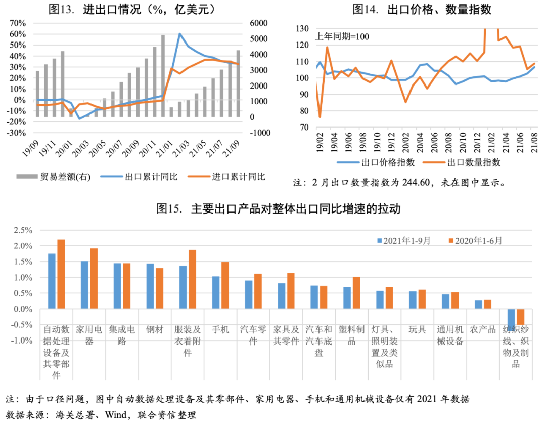 三季度出口增速有所放緩,主要是由于上年基數(shù)抬高。全球經(jīng)濟和貿(mào)易回暖帶來的需求增加是支撐我國出口的主要因素,但三季度以來出口價格上漲對出口金額的貢獻度上升,集成電路、手機和家用電器等受大宗商品漲價明顯的行業(yè),出口均表現(xiàn)出量減價增的特點。從三季度主要出口產(chǎn)品對整體出口同比增速的拉動來看,自動數(shù)據(jù)處理設(shè)備及其零部件、家用電器和集成電路依然是出口的最大拉動項;紡織紗線、織物及制品對出口的負(fù)向拉動進一步增大。四季度,海外需求修復(fù)疊加出口價格上漲或?qū)⒅纬隹谝廊槐3衷谳^高的水平,但在上年基數(shù)抬高的因素影響下,四季度整體出口增速將小幅下行。