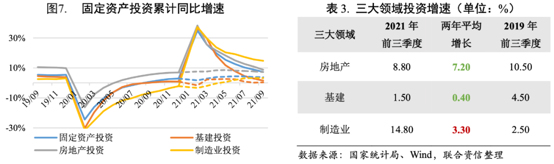 三季度固定資產(chǎn)投資有所放緩。2021年前三季度,全國固定資產(chǎn)投資(不含農(nóng)戶)39.78萬億元,同比增長7.30%;兩年平均增長3.80%,比上半年兩年平均增長放緩0.60個百分點,三季度固定投資增長有所放緩,前三季度固定投資三大領(lǐng)域中僅制造業(yè)投資兩年平均增長回到疫情前水平。