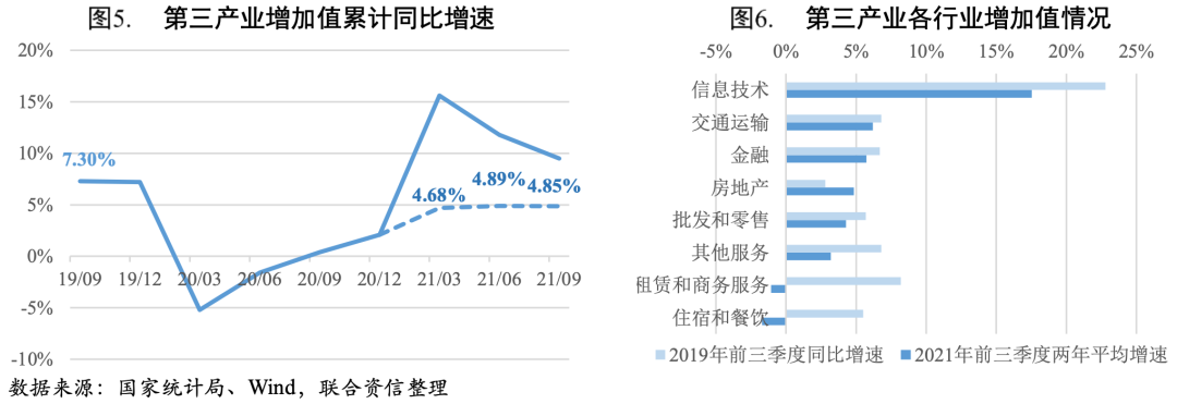 從三大產(chǎn)業(yè)來看,三季度第一、二產(chǎn)業(yè)增加值兩年平均增速[2]均高于疫情前2019年同期的水平,恢復(fù)情況良好;而第三產(chǎn)業(yè)增加值兩年平均增速仍未回到疫情前水平,主要是服務(wù)業(yè)受局部疫情反復(fù)影響較大。