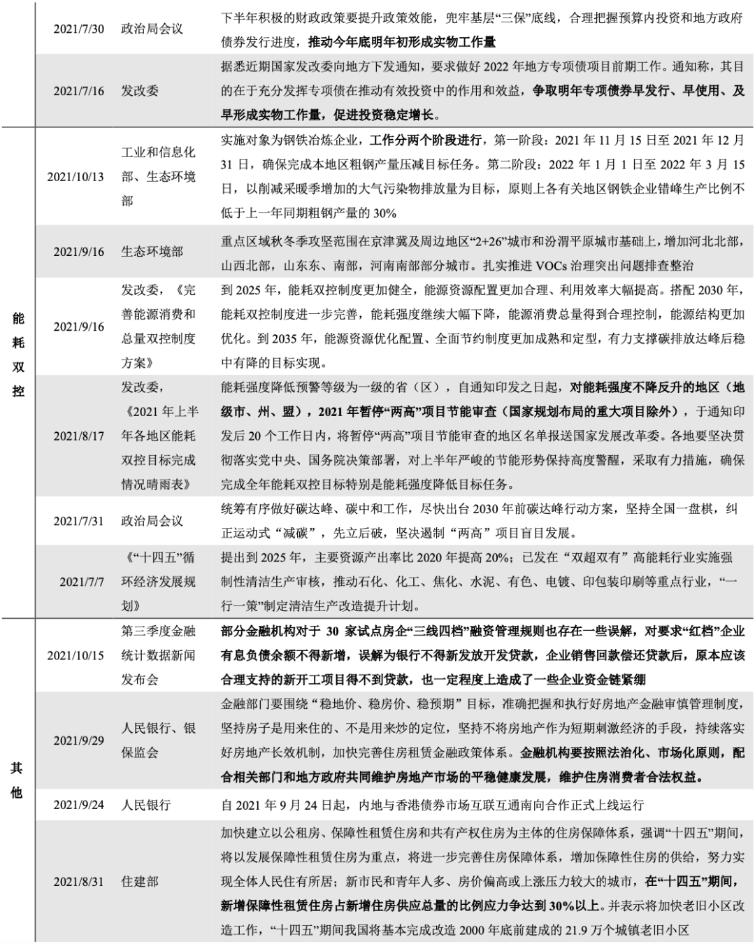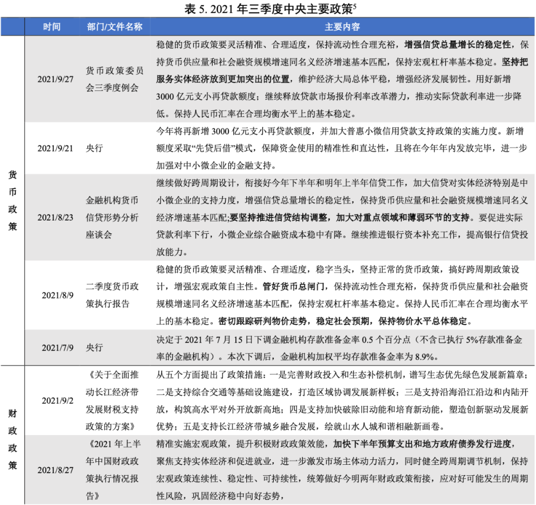 2021年三季度,貨幣政策方面,年內(nèi)首次下調(diào)金融機構(gòu)存款準(zhǔn)備金率0.5個百分點釋放長期資金約1萬億元,新增3000億元支小再貸款額度加大支持小微企業(yè)力度,整體來看三季度信貸總量增長穩(wěn)定,同時突出信貸結(jié)構(gòu)調(diào)整;財政政策方面,地方政府債的發(fā)行進度有所加快,財政支出呈增長趨勢。“碳中和”要求與“能耗雙控”行動下,限電限產(chǎn)政策在三季度有所加碼。