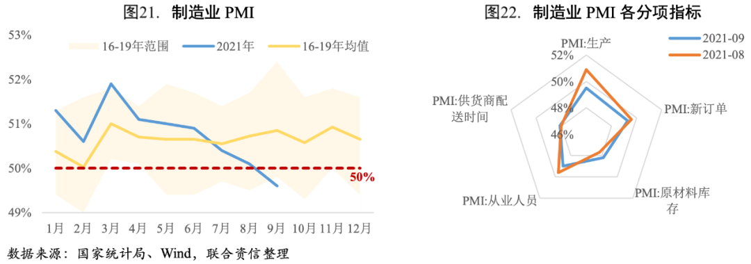 2021年三季度制造業(yè)PMI呈現(xiàn)逐月小幅下降的趨勢,9月制造業(yè)PMI跌至49.6%,產(chǎn)需兩端均降至榮枯線下,制造業(yè)生產(chǎn)活動和市場需求總體放緩。從行業(yè)角度看,在調(diào)查的21個行業(yè)中,有12個高于臨界點,比上月增加2個,但石油煤炭及其他燃料加工、化學(xué)纖維及橡膠塑料制品、黑色金屬冶煉及壓延加工等高耗能行業(yè)生產(chǎn)和新訂單兩個指數(shù)均進一步下滑至45.0%以下,反映了9月制造業(yè)PMI降至榮枯線下更多的是受高能耗行業(yè)影響。