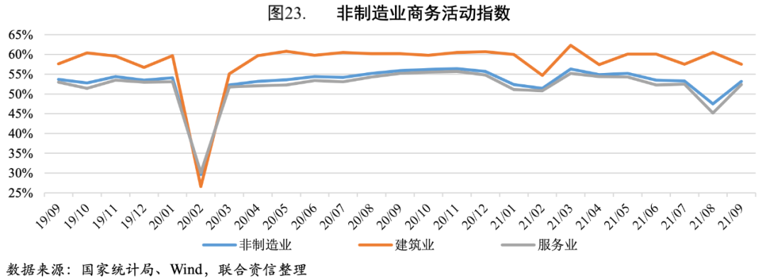 2021年三季度非制造業(yè)商務(wù)活動指數(shù)呈現(xiàn)V型,8月降至榮枯線以下,9月重回擴張區(qū)間。9月份,非制造業(yè)商務(wù)活動指數(shù)為53.2%,高于上月5.7個百分點,升至臨界點以上,非制造業(yè)景氣水平快速回升,其中服務(wù)業(yè)恢復(fù)明顯,建筑業(yè)仍位于較高景氣區(qū)間。