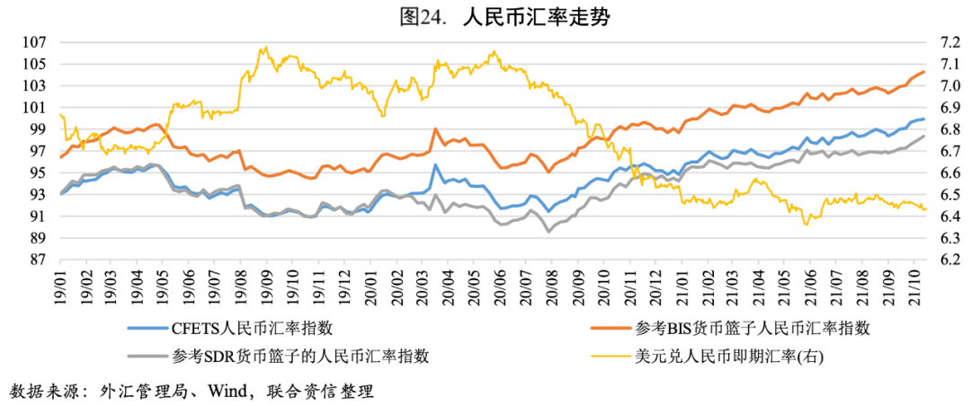 2021年以來,美元兌人民幣匯率雙向?qū)挿▌樱径纫詠聿▌訁^(qū)間收窄;人民幣三大匯率指數(shù)延續(xù)2020年下半年以來的升值趨勢,主要是由于我國經(jīng)濟相對較好且國內(nèi)疫情顯著好于海外,支撐人民幣匯率指數(shù)堅挺。四季度,預(yù)計人民幣三大匯率指數(shù)或?qū)⑿》H值,主要是由于四季度我國經(jīng)濟恢復(fù)的挑戰(zhàn)增多,與海外經(jīng)濟體的經(jīng)濟優(yōu)勢收窄,且各經(jīng)濟體生產(chǎn)受疫情影響的敏感性下降;Taper臨近疊加美國經(jīng)濟在疫苗接種和強有力政策支持下繼續(xù)改善,人民幣兌美元匯率將面臨一定的貶值壓力,但中美關(guān)系緩和利好人民幣,所以整體貶值壓力可控。