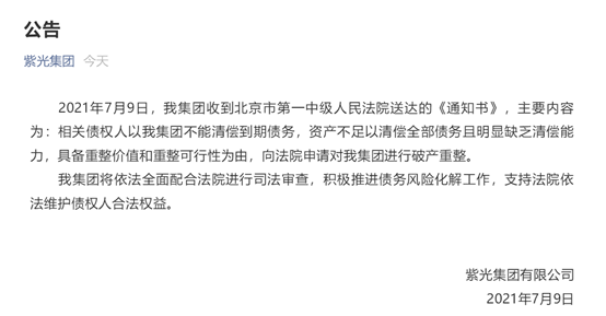 2021年7月9日,紫光集團發布公告稱,收到北京市第一中級人民法院送達的《通知書》,主要內容為:相關債權人以紫光集團不能清償到期債務,資產不足以清償全部債務且明顯缺乏清償能力,具備重整價值和重整可行性為由,向法院申請對紫光集團進行破產重整。