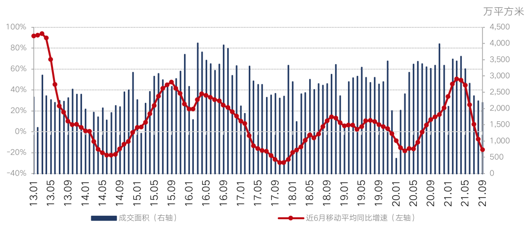 具體來看,2021年10月,易居研究院監測的40個典型城市新建商品住宅成交面積環比下降1.9%,同比下降32.4%,創下2013年以來最差“銀十”,考慮到市場觀望情緒以及信貸政策尚未全面放松,預計接下來40城新建商品住宅成交量仍在探底,短時間內或將持續收縮。